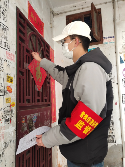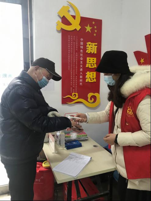 杜若菲同学安全到家后,积极投身于家乡疫情防控工作中。为来社区办事处办事的人员进行体温测量和登记。在社区里面进行防疫宣传以及询问是否有快要反汴的人员还未报备的。