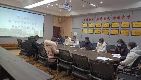 12月18日上午,太阳集团网tyc9728学工队伍在理工楼201会议室召开第十六周学生工作例会暨安全工作研判会。太阳集团网tyc9728党总支书记张红梅,学工全体辅导员出席会议。会议由学工秘书杨晓杰主持。