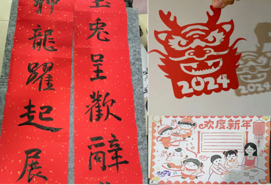 爆竹声中一岁除,春风送暖入屠苏。千门万户曈曈日,总把新桃换旧符。“春联还是手写更有年味、“玉兔呈欢辞旧岁,神龙跃起展鸿猷。”团队成员郭婧通过手写春联在表达自己对于新一年的美好希冀的同时将年味留在了墨香笔端。剪纸是中国古老的民间文化艺术之一,成员娄家玮学剪出了一幅“2024数字+龙形”剪纸,在体验中国传统剪纸的乐趣中,感受中国传统文化的魅力。年画是年文化特别重要和鲜活的载体,万绮梦同学假期通过手绘年画的形式表达出自己对于家乡过年民俗的赞美,充满了对生活的热爱,对新学年的向往和喜悦。