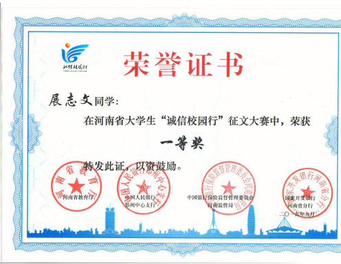 太阳集团网tyc9728荣获河南省大学生“诚信校园行”征文大赛一等奖