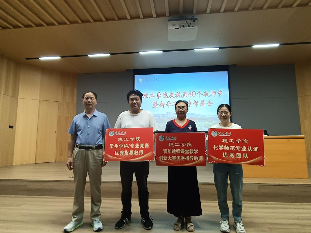 会议第一阶段,教学秘书赵丹宣读表彰文件,由肖生发院长为青年教师课堂教学创新大赛优秀指导老师姚素梅教授、化学师范专业认证优秀团队教师代表刘仁植、学生学科竞赛优秀指导教师周梦颁发奖状。化学师范专业认证工作负责人刘仁植副教授和2024年河南省教育系统教学技能竞赛一等奖获得者张艺老师先后发言,回顾了上学期的工作,同时对新学期的工作进行了展望。