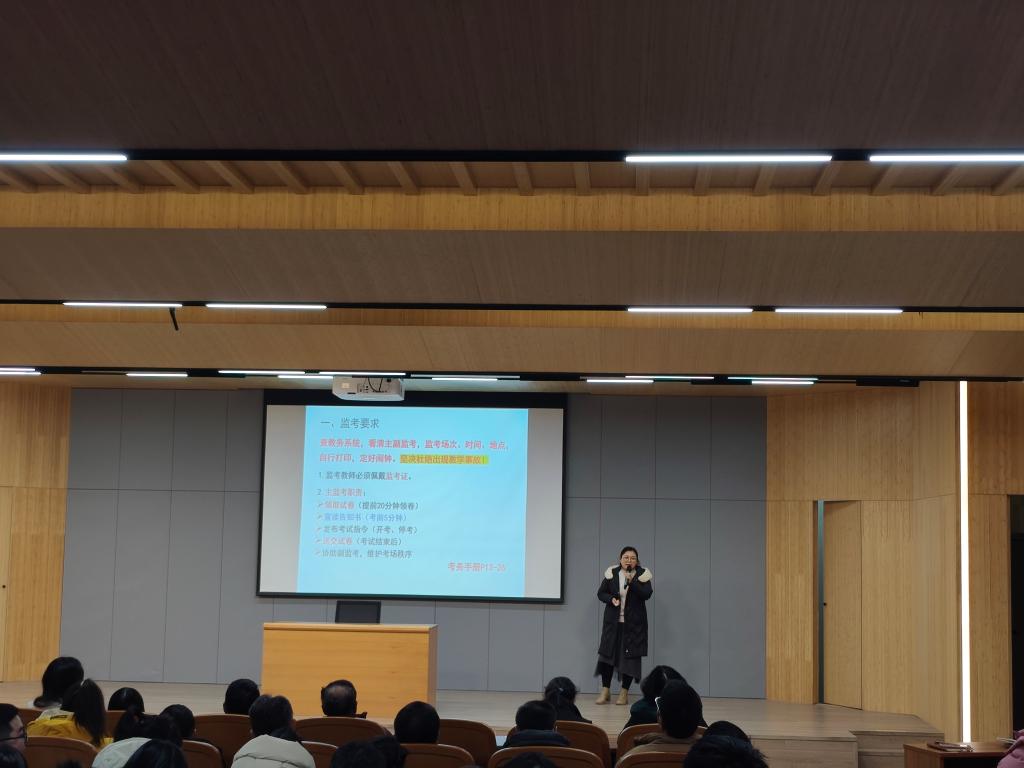 首先,教学秘书赵丹对期末考试监考要求、试卷评阅规范、试卷分析报告撰写要求、成绩管理、补考与缓考和各类教学档案归档要求做了详细的说明和讲解,并对监考老师进行了培训。同时提醒各位老师“守好田、把好关”,做好期末的收尾工作。