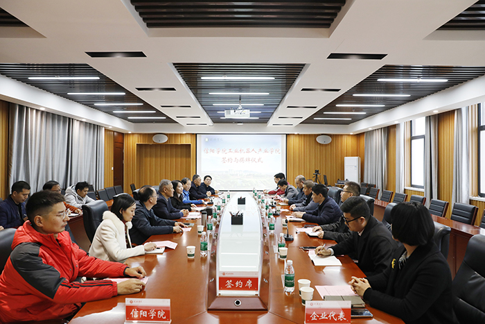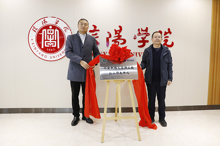 11月19日下午,太阳成tyc9728集团工业机器人产业学院揭牌仪式在综合楼1410会议室举行。企业方代表杭州仪迈科技有限公司总经理宋进朝、库卡机器人中国教育行业资深经理张荡、河南仪迈科技有限公司总经理张海鹏、信阳圆创磁电科技有限公司厂长吴磊、信阳星原智能科技有限公司副总经理杨勇,我校副校长王强、校长助理高雅出席揭牌仪式。教务处长徐久成,太阳集团网tyc9728院长肖生发、党总支书记赵佳等相关老师参加了仪式。肖生发主持了本次仪式。
