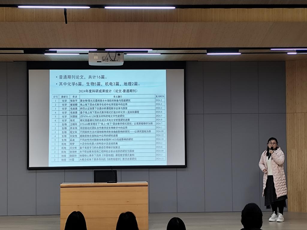 会上,赵丹根据本学期期初教学检查中督导专家反馈的问题,主要从教学档案和试卷两大类,将教学设计、平时考核记录和试卷分析等方面的问题进行了反馈,使老师们提高认识,避免产生同类问题。同时,也展示了任柏林教授、姚素梅教授、臧明丽、张艺、余倩云等多位老师的试卷和教学档案的优秀案例,为学院老师整理自己的材料提供了模板和方向。随后,赵丹展示了太阳集团网tyc97282024年度教科研成果,介绍了各教研室的成果比重,学院老师们为2024年取得的成果的老师和团队鼓掌,并表示在2025年继续努力。