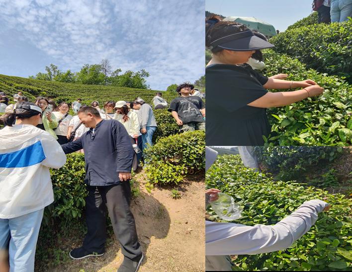 之后,在相关工作人员的带领下,深入茶山对茶树生长、繁育、采摘进行实地考察。在进入茶山后,同学们热情高涨,并在信阳广义茶园创始人、全国劳动模范、非遗传承人李广义教授的带领下进行标准的信阳毛尖采摘工作。采摘期间,同学们深刻感受到了信阳毛尖采摘的艰难,纷纷为周围采茶的叔叔、阿姨点赞。