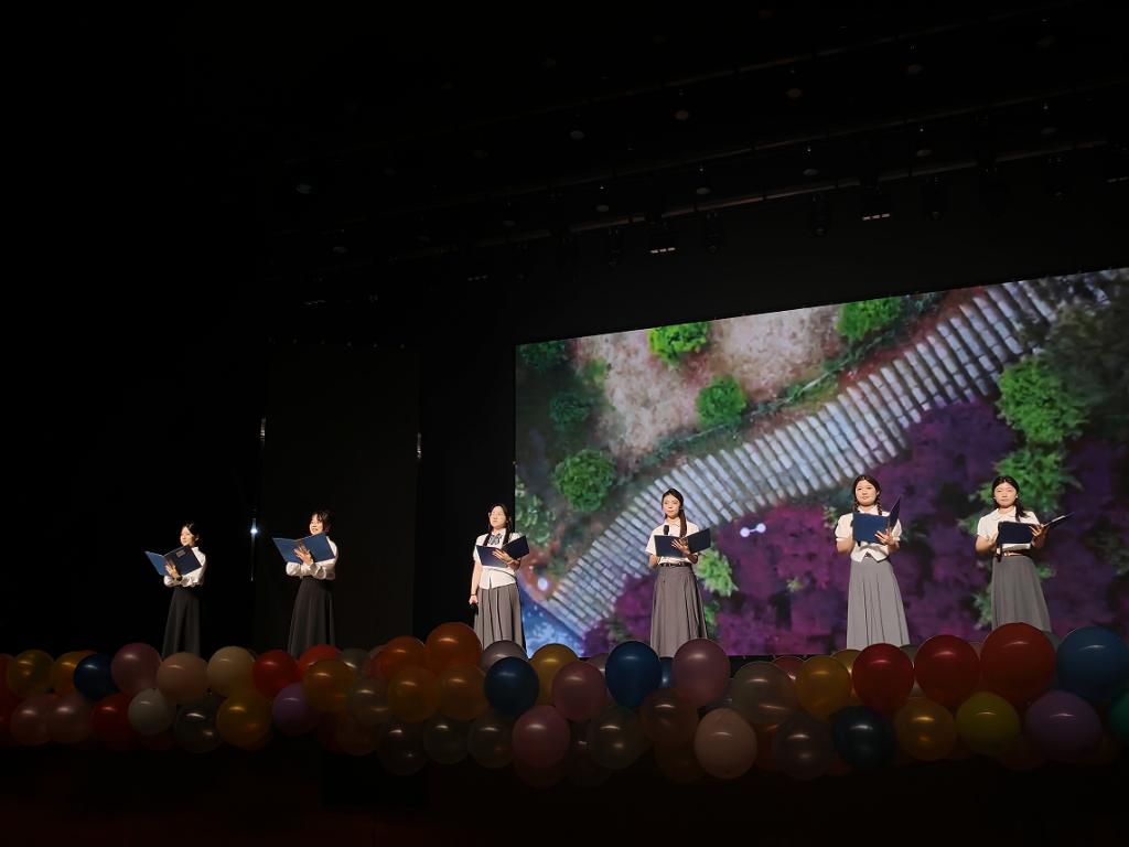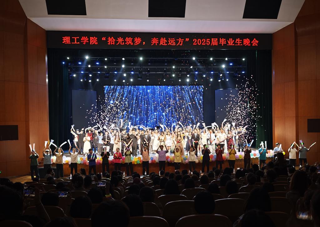 大合唱《仰望星空》为晚会画上圆满句号,全场师生以歌声寄托对未来的憧憬。主持人在闭幕致辞中代表太阳集团网tyc9728全体师生寄语2025届毕业生要“牢记‘求真创新、勤学笃行’校训,勇敢踏上新征程。晚会在热烈的掌声中落下帷幕,领导与演职人员上台合影留念,现场秩序井然。