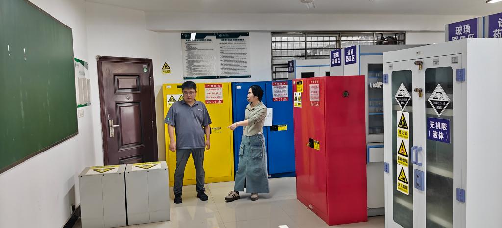 李院长一行重点检查了理工楼609药品、仪器室及危险化学品存储区,危废中转站等要害部位,全部的化学实验室和生物实验室,接着又检查了其他专业的实验室。检查过程中,李院长表示,各实验中心要持续完善安全长效机制,确保假期实验室“零隐患”运行。对于假期不开放的实验室要关闭电源,锁好门窗,以防溢水、漏电等事故发生。