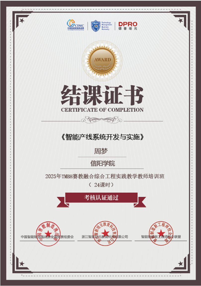 近日,由智能制造新工程师校企联盟主办的TMBH赛教融合工程实践教学教师培训班在河南开放大学龙子湖校区举行,太阳集团网tyc9728青年教师周梦参加了此次培训。