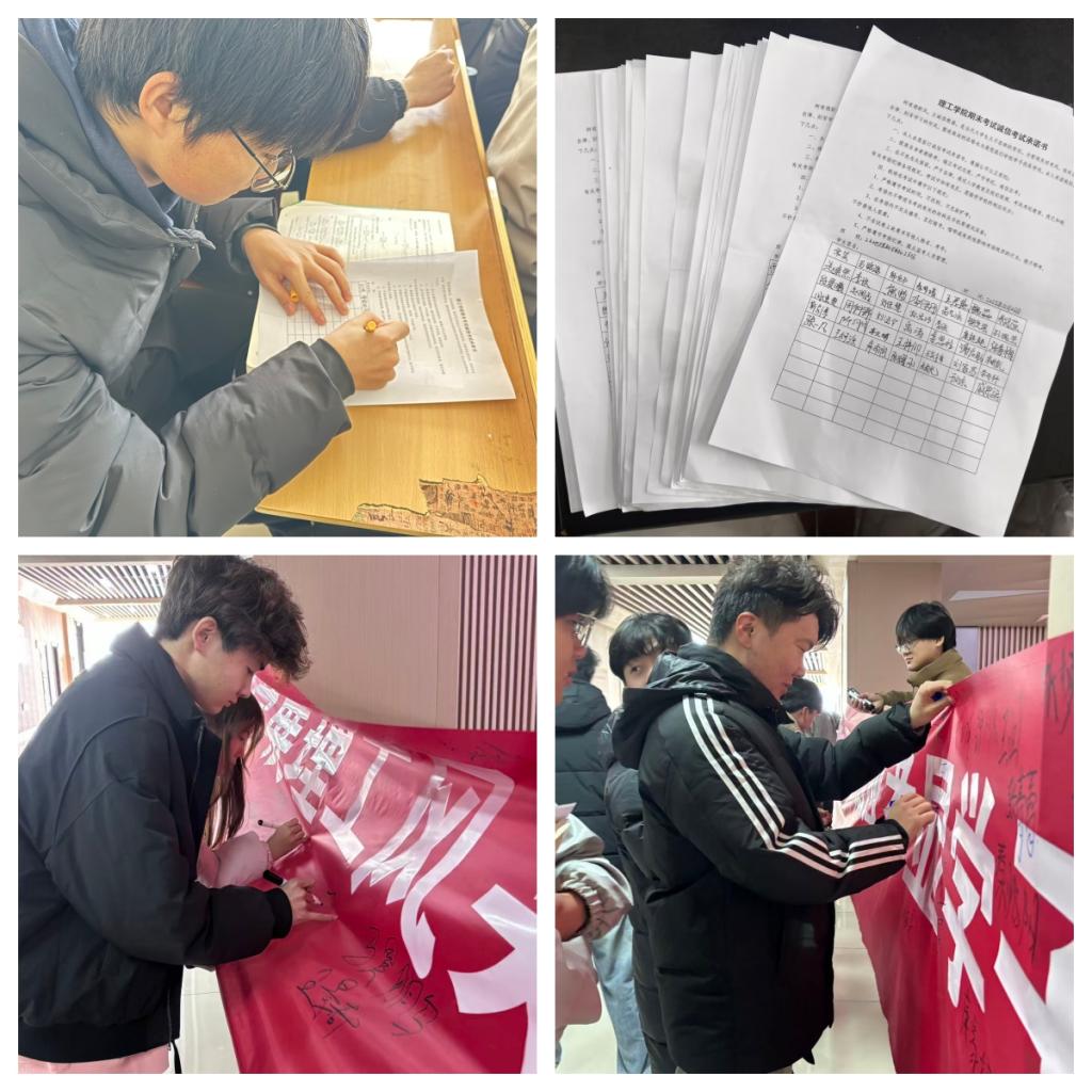 以诚为基,一诺千金。学院组织各班班委率先开展“诚信考试承诺”横幅签名活动,班委们郑重在横幅上签下自己的名字,以实际行动率先垂范,表达了恪守考纪、诚信应考的坚定决心。班会结束后,辅导员在班级内有序组织全体同学开展诚信考试承诺书签字活动。同学们认真阅读承诺书条款后,逐一签署姓名,通过书面承诺的形式,将诚信考试的意识内化于心、外化于行,进一步强化了遵守考试纪律、维护公平考风的集体共识。