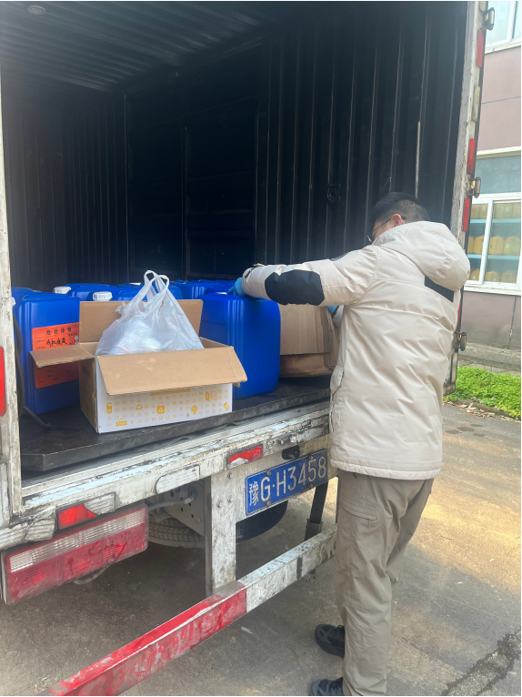 现场处置中,实验中心主任杨潇剑全程监督,协同专业资质企业工作人员完成危废核查、称重、登记。转运环节严格落实安全防护措施,实现全程闭环管理,确保250L废液及25kg试剂瓶安全转运至专业场所进行无害化处理。