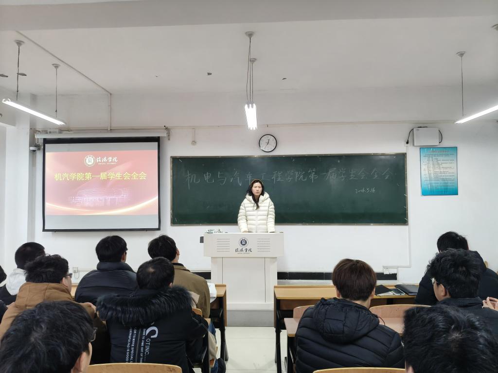 会议在庄严而热烈的氛围中拉开帷幕。团总支书记田亚星首先致辞,向第一届学生会及团总支的成立表示热烈祝贺,并对全体学生干部提出殷切期望。随后,主席团成员王俊绅宣读了《机电与汽车工程学院学生会章程》,各部门负责人依次上台,围绕部门职能定位与新学期工作计划进行详细介绍,展现了首届学生会昂扬向上的精神风貌和务实笃行的工作态度。