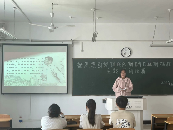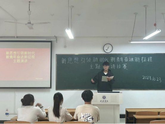 新时代呼唤新思想,新思想引领新青年,新青年奋进新征程。张建阁慷慨激昂地陈词道,我国发展正处于新的历史发展阶段,更要把握时代机遇,以昂扬的姿态大步向前走去。温佳振掷地有声的讲道,新时代的中国青年要以实现中华民族伟大复兴为己任,增强做中国人的志气、骨气和底气,不负时代,不负韶华,不负党和人民的殷切期望!我们作为新青年,应成为国家的脊梁、时代的先锋。以实际行动践行新时代中国特色社会主义思想,以奋斗在新的征程中取得更加辉煌的成就。