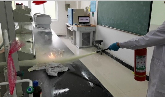 在随后进行的应急演练环节,模拟了实验室因操作失误发生危险废液泄漏,进而引发环境事件及火情的场景。杨老师现场讲解了试剂泄漏的紧急应对措施,包括快速识别泄漏源、有效划定隔离区域、正确选择和个人防护装备等关键步骤。要求师生要熟悉逃生通道,会判定火情,掌握求救方法、撤离方法、灭火器使用方法等。