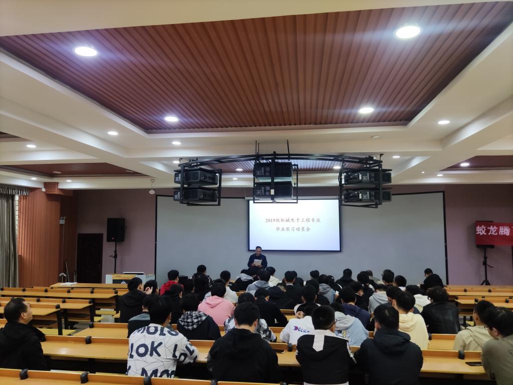 首先,黄阳教授对2019级机械电子工程专业毕业实习的实习时间、实习地点以及人员分配进行了详细安排;然后,曹国廷教授宣读了学校专业实习工作的管理规定,强调了毕业实习目的和毕业实习的重要性,要求学生在实习期间遵守实习生守则,遵守实习单位的工作纪律和规章制度,并按实习计划完成实习的全部任务;接着,学生签订了毕业实习安全承诺书;最后,王仲初教授作实习动员讲话,要求学生严格按照单位要求确保生产安全、生活安全,杜绝任何人身和财产安全事故发生,同时要学会在新环境下与人沟通,并妥善处理好日常生活工作中的问题和矛盾,培养良好的职业道德。