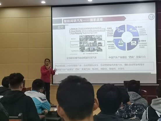 王教授以车辆工程专业概述、技术变革与智能汽车、汽车产业基本数据、人才就业途径四个方面进行展开详细的论述。讲座特别介绍了汽车的工业发展历程,通过历年的汽车产业基本数据,对中国未来汽车产业的发展趋势进行了说明。王教授通过这些年来研究的成果,结合当代汽车正在处于深入的变革时期,以智能网联汽车为例,深入浅出的讲解了汽车从结构、设计、理论、试验、制造装备、工艺、产品营销等多方位的变革过程,阐述了智能网联汽车未来的发展更安全、更高效,是迈向汽车强国的重要抓手。最后王教授就学生关心的人才就业提出了自己的意见,他介绍了国内汽车产业链的布局,特别提出汽车人才需求缺口的方向及知识能力要求,鼓励学生学好专业知识,毕业后在适合自己的岗位上做出一番贡献。