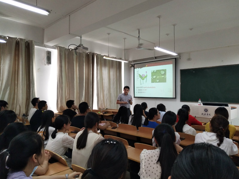 本次报告围绕“人工荷叶的化学构建与超疏水性能”和“负载型催化材料的电子迁移行为与性能增强”两个主题展开。刘丽君博士首先从荷叶“出淤泥而不染”的特性出发,提出超疏水性能与表面的分级微纳米结构密切相关的观点,以金属铝和铜为例,细致入微地向师生们介绍了该课题组构筑超疏水材料的具体工作。然后又系统地介绍了其课题组近些年来在光催化领域的研究进展。