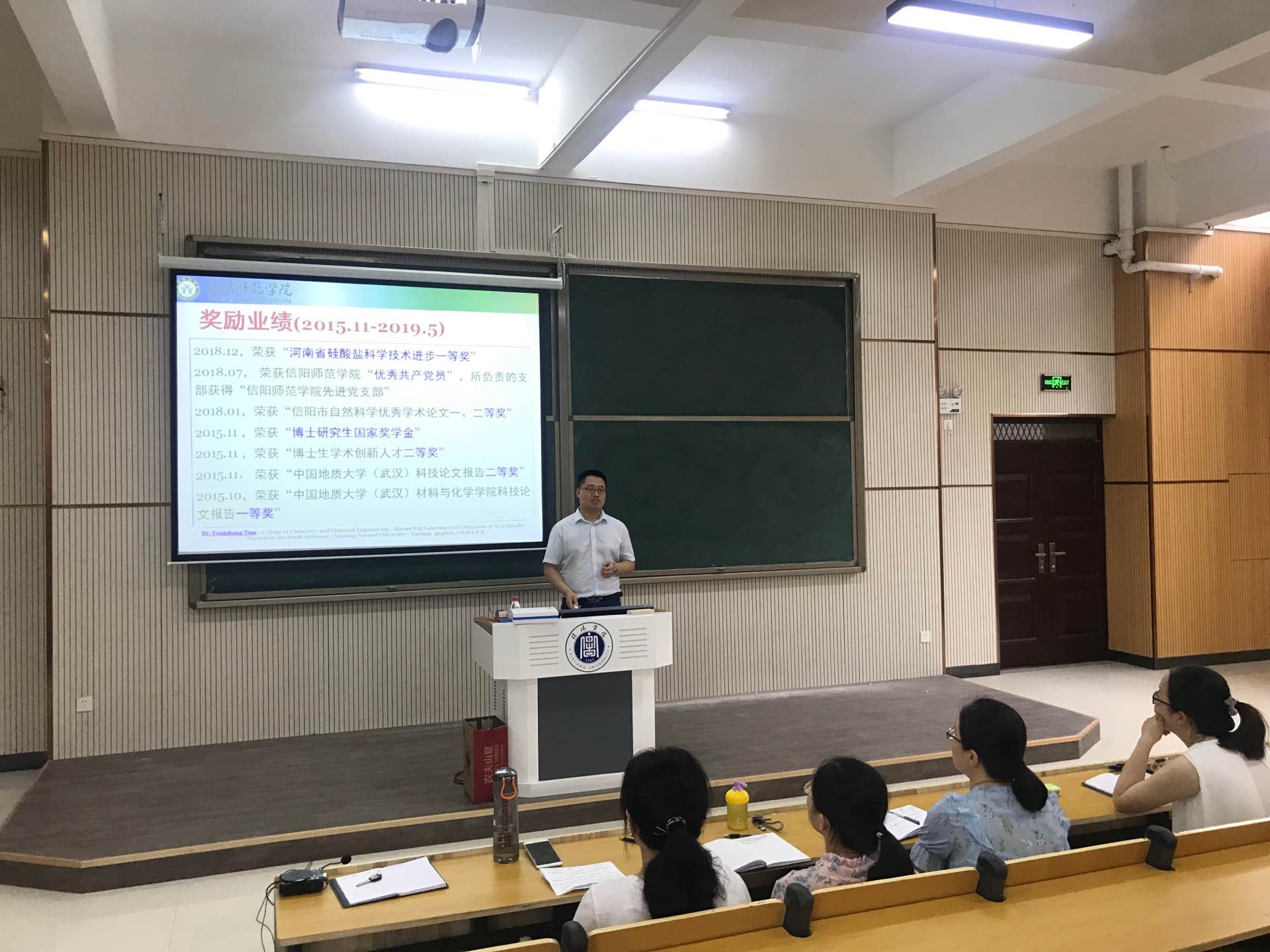 报告会上,田博士首先结合相关研究成果由浅入深、耐心细致的向同学们讲解了自己在BCZT基无铅压电陶瓷上的最新研究进展和科研过程中的心路历程,以及在课题组和硬件仪器设备建设上的情况。然后,向师生们展示了信阳上天梯矿区资源储备、开发利用等方面的情况以及对河南省豫南非金属矿资源高效利用重点实验室进行了介绍。最后,田博士高度肯定了我院化学专业毕业生在师院读研期间的优异表现,同时指导鼓励大家认真学习好基础知识,不断培养自己的科研能力,提升考研竞争力,并表示欢迎我院学生报考其研究生,师生们也都十分踊跃的针对自己感兴趣的方面进行了提问和交流。