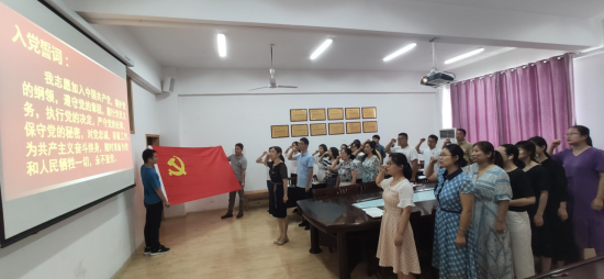 在党总支副书记张红梅的领誓下,全体党员教师重温入党誓词。会议在大家集体合唱《没有共产党就没有新中国》的歌声中落幕。