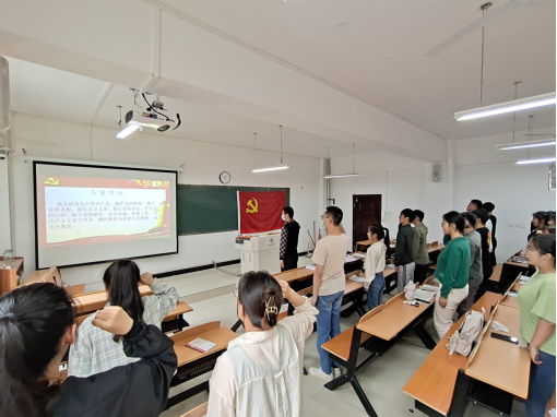 杨晓杰带领预备党员进行入党宣誓,全体党员重温入党誓词。