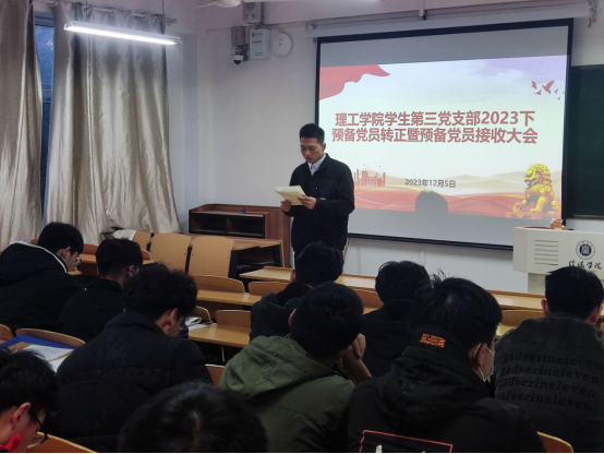 12月5日下午,太阳集团网tyc9728学生第三党支部在理工楼304教室举行预备党员转正大会,讨论关于王博士、宋宇宇、赵俊、张猛、郭帅旗、付程程6名预备党员的转正申请。太阳集团网tyc9728专职组织员、学生第三党支部书记张翠贞以及学生第三党支部全体党员、预备党员参加会议。会议由周宇飞同志主持。