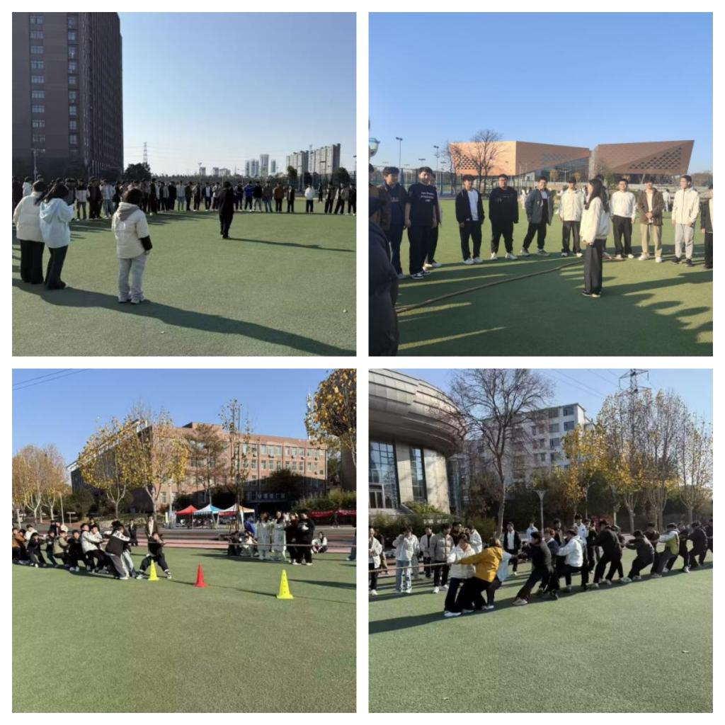随后的拔河比赛将活动推向高潮。两班同学各自组队,围绕“前中后站位”展开热烈讨论,力气大的同学主动站在前端“发力”,协调性好的同学负责中间“稳节奏”,大家分工明确、相互鼓劲。随着裁判哨声响起,双方队员紧握绳子、身体后倾,使出全力向各自方向拉扯。场边同学挥舞手臂、高声呐喊助威,“加油”声此起彼伏。即便有人手心磨红,也始终坚持不放弃,充分展现了两班同学的拼搏精神与团队协作力。