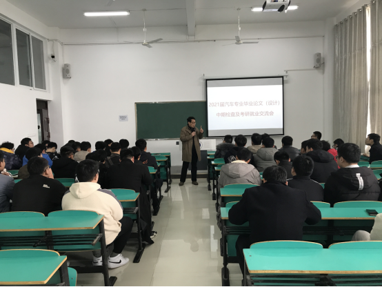 3月10日下午,汽车工程教研室全体教师和2017级车辆工程本科班、2017级汽车服务工程本科班、2019级汽车服务工程专升本班学生在实验实训中心107教室召开2021届汽车专业毕业论文(设计)中期检查及考研就业交流会。会议由汽车工程教研室教研室主任助理王思满老师主持。