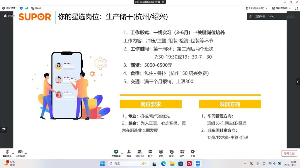 宣讲会上,苏泊尔家电制造有限公司龚经理通过企业宣传片、PPT 演示等丰富形式,全方位展现了公司的发展历程、行业地位、核心业务及未来战略布局。针对毕业生关注的重点,龚经理详细介绍了公司的职业发展体系、人才培养计划、岗位需求方向及薪酬福利政策、培训机制等关键信息,让同学们对企业及招聘岗位有了清晰认知。