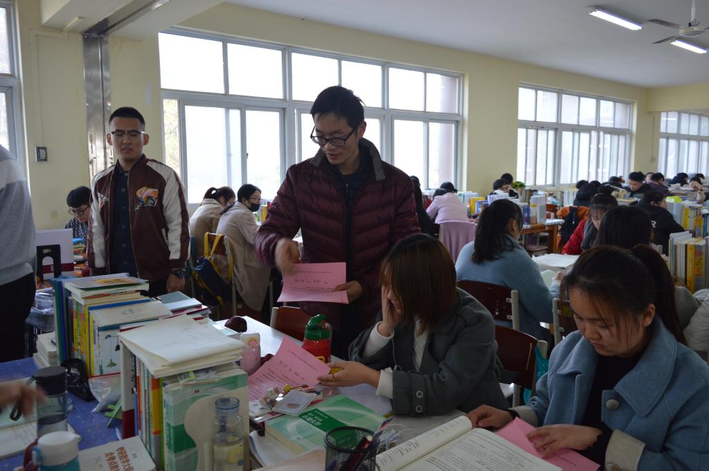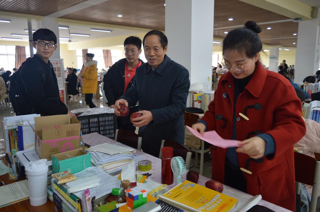 “漫漫研途,你从来不是孤身一人,加油!”、“将来的你,一定会感谢现在拼命的自己。”、“坚持是一场最美的修行,以梦为马,不负韶华!”在图书馆自习室,随处可见的标语激励着同学们奋斗,喧嚣的背书声回荡在在教室内外。院长肖生发一行的到来吸引了同学们的关注,肖院长将苹果和考研寄语分发到考研学生手中并与他们亲切攀谈起来,勉励他们在最后冲刺阶段,攻坚克难,戒骄戒躁,以沉着稳重的姿态面临考试的到来。