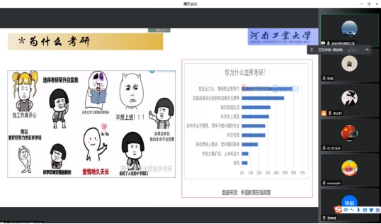 考研动员大会结束后,李文轩老师邀请了河南工业大学的胡乐乾教授对同学们进行考研指导,本次指导采用腾讯会议线上方式进行,2019级、2020级化学专业学生参加了本次会议。会议上,胡乐乾教授就考研的优势、现状及院校选择进行了深入详细的指导,整个会议持续了近两个小时,通过胡教授的考研指导,同学们均表示仰取俯拾、收益颇丰。