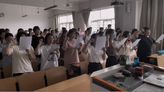 会议伊始,张秋平主任指出,此次动员大会的目的是为了使正在备战考研的同学们更加明确自己的考研方向,完善备战方法,引导大家考研选择,助力同学们考研成功。在考研必要性方面,姚素梅教授首先进行考研指导,考研是为了使同学们就业的选择性扩大,更好的参与就业,提升自己的竞争力。随后马艳梅老师就暑假考研备战期间的安全向同学进行了说明与强调,吴艳玲老师则结合自身经历告诉大家,考研并不难,只要勤加练题与做题,考试时安排好并把握好时间,一定能够实现自己的理想,最后由李文轩老师带领同学们进行了神圣而庄重的宣誓仪式。