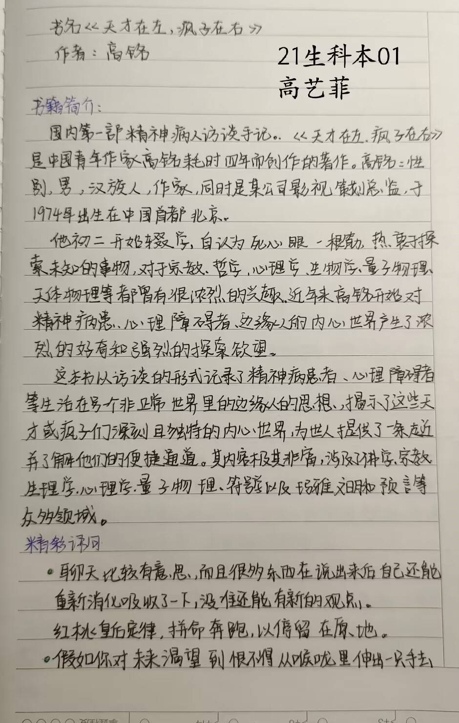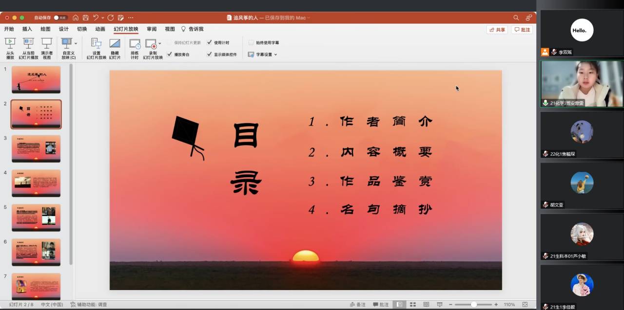 线上读书分享活动一共有13名同学参加,同学们通过讲述自己喜欢的书目,用读书笔记来记录阅读过程中的所想所思所悟。21化学本03班安意雯分享的书目是《追风筝的人》,阐述了“人生就是这样,不断的犯错,然后弥补,在通往好人的路上,阿米尔一直在努力。阿米尔追着风筝穿越了城市的大街小巷,在追风筝的过程中得到了成长。”21化学本01班李聪伶分享的书目是《挪威的森林》,向大家讲述了“我们在长大,我们在不断地在明白这个世界,在知晓这个世界,自己也在不断变化着,来适应这个世界,融入这个世界。”21生科本01班高艺菲通过分享《天才在左,疯子在右》这本书,讲述了“我们要试着去理解别人的世界,容纳别人的观点,多倾听他人的想法和意见”。此外,其他同学依次对自己喜欢的书目进行介绍,并分享自己的感悟。